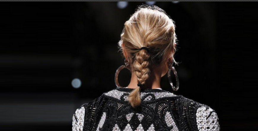 La tresse queue de cheval. Oui oui ! Celle que vous faisiez quand vous étiez petite ! Cette année, la tresse queue de cheval fait son grand come back et a été vue au défilé Balmain. Pour faire la même, rien de plus facile : on s'attache les cheveux en queue de cheval, on tresse et on attache. Attention, on opte pour des élastiques de la même couleur pour ne pas retomber en maternelle !