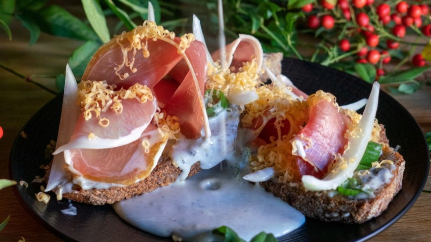 **Tartine truffé, pain de campagne, oignons caramélisés et jambon Serrano**