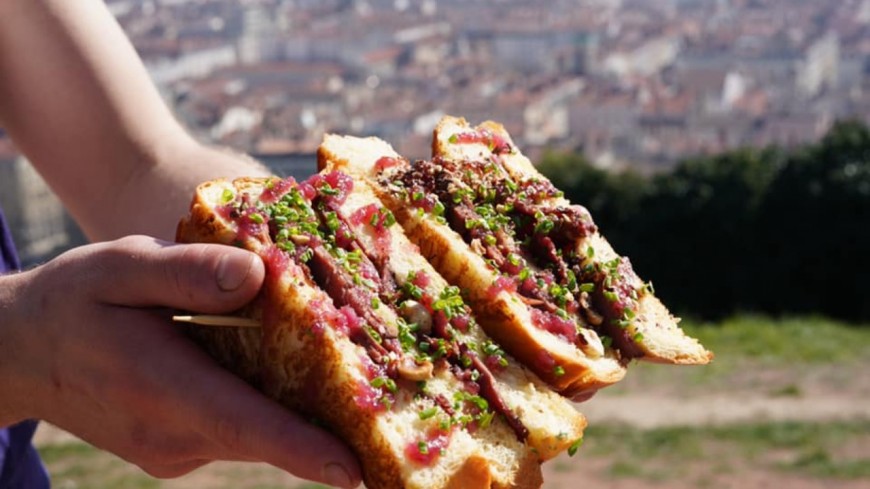 NYC lovers: Brioche au beurre toastée, pastrami (viande de bœuf fumée au poivre vert), chutney d’oignon aigre doux, sauce honey mustard, noisettes, copeaux de comté