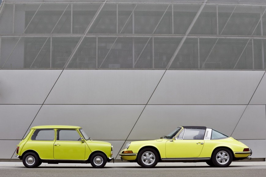 L’hommage se déroule sous forme de séance photos durant laquelle deux modèles de couleur flashy jouent ensemble devant l’objectif . Pourtant a priori rien ne les rapproche, l’une étant la star des mini citadines, l’autre la reine des sportives. Et c’est à l’initiative (surprenante) de BMW que la Mini classique et la Porsche 911 Targa type 901 se sont retrouvées, la première venant souffler les bougies des 50 ans de la seconde. Une manière pour l’anglaise de se comparer à l’allemande, chose impossible sur le papier.