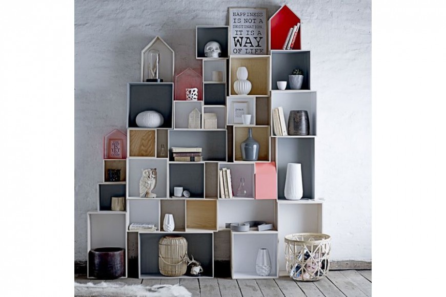 On adore ces assortiments d'étagères en bois designées par Bloomingville, naturelles autour et colorées dedans, elles permettent le rangement de livres, bougies et autres objets décoratifs.
