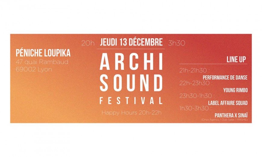 L’association Archisound Festival est de retour avec une nouvelle équipe, des soirées hors des murs et pour l’occasion un nouveau concept, les soirées OUT. Le Jeudi 13 Décembre à la péniche LOUPIKA, soyez les premiers à participer à ces soirées d’un nouveau genre ! « La House », voilà le thème de la OUT#1. Alors, venez vous déhancher toute la nuit.